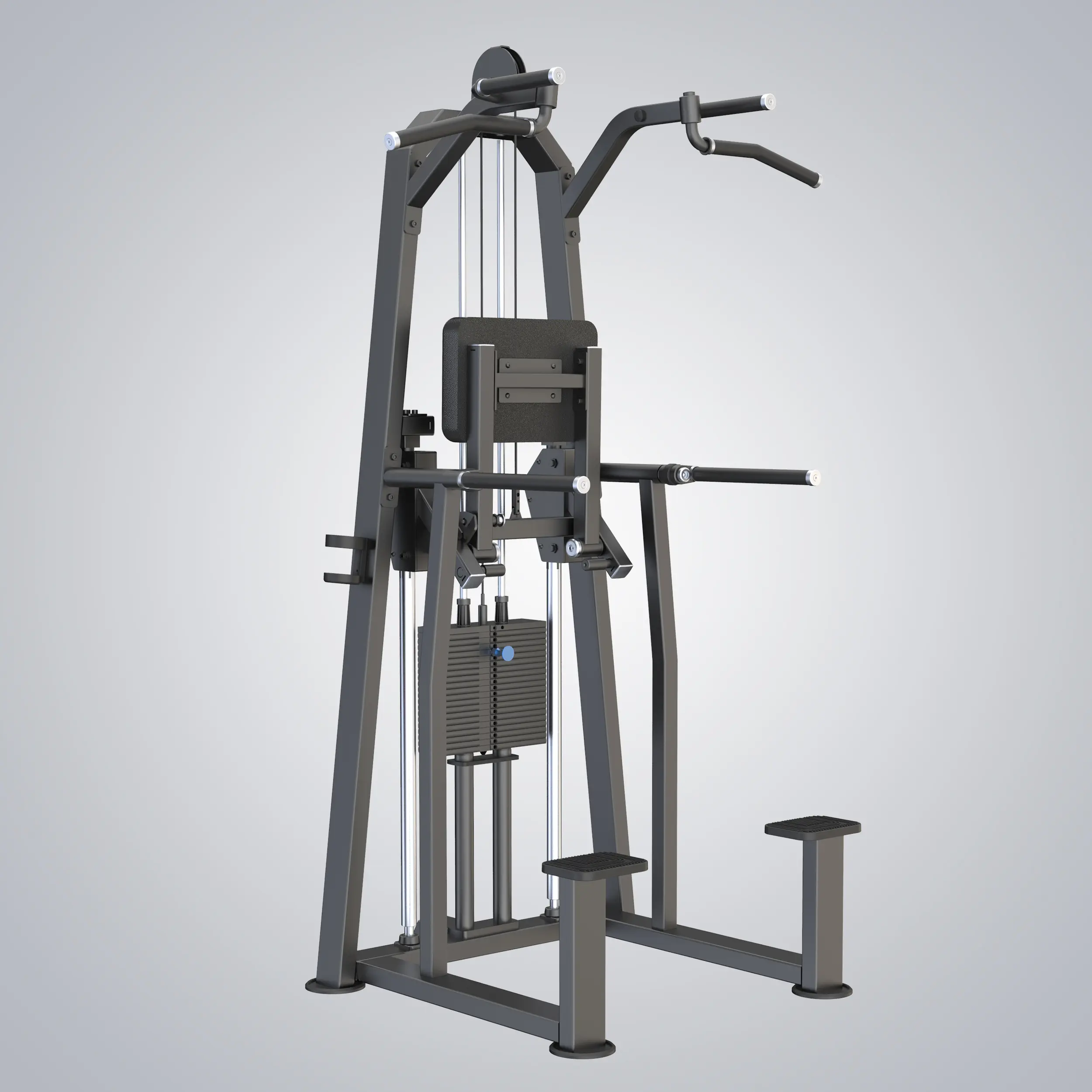U3009 – The Evost Series Dip/Chin Assist not only can it be used as a part of the serial modular core of a plug-in workstation or a multi-person station, but it is also a mature dual-function system. Large steps, comfortable knee pads, rotatable tilt handles and multi-position pull-up handles are part of the highly versatile dip/chin assist device. The knee pad can be folded to realize the user’s unassisted exercise. The linear bearing mechanism provides guarantee for the overall stability and durability of the equipment.